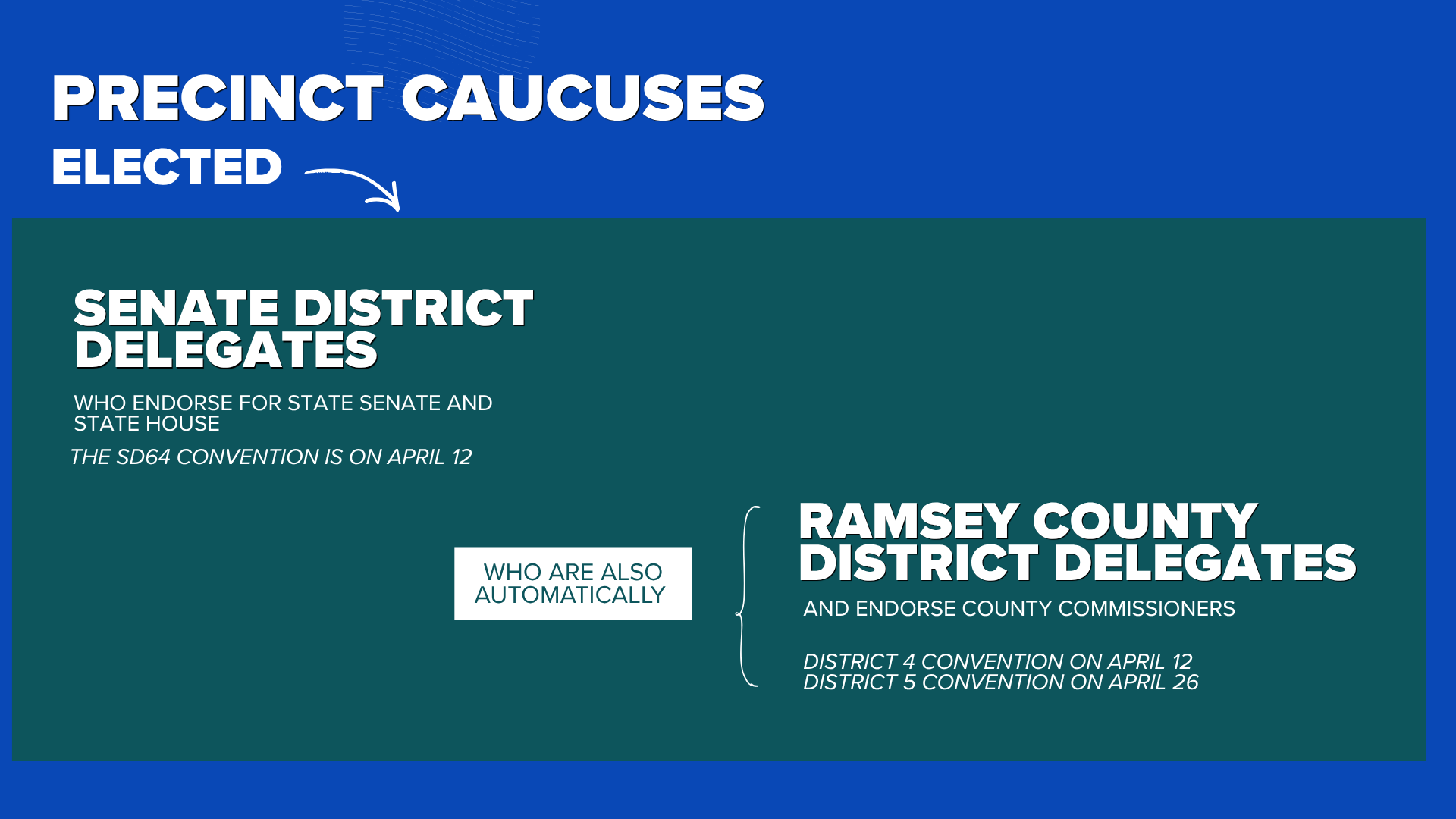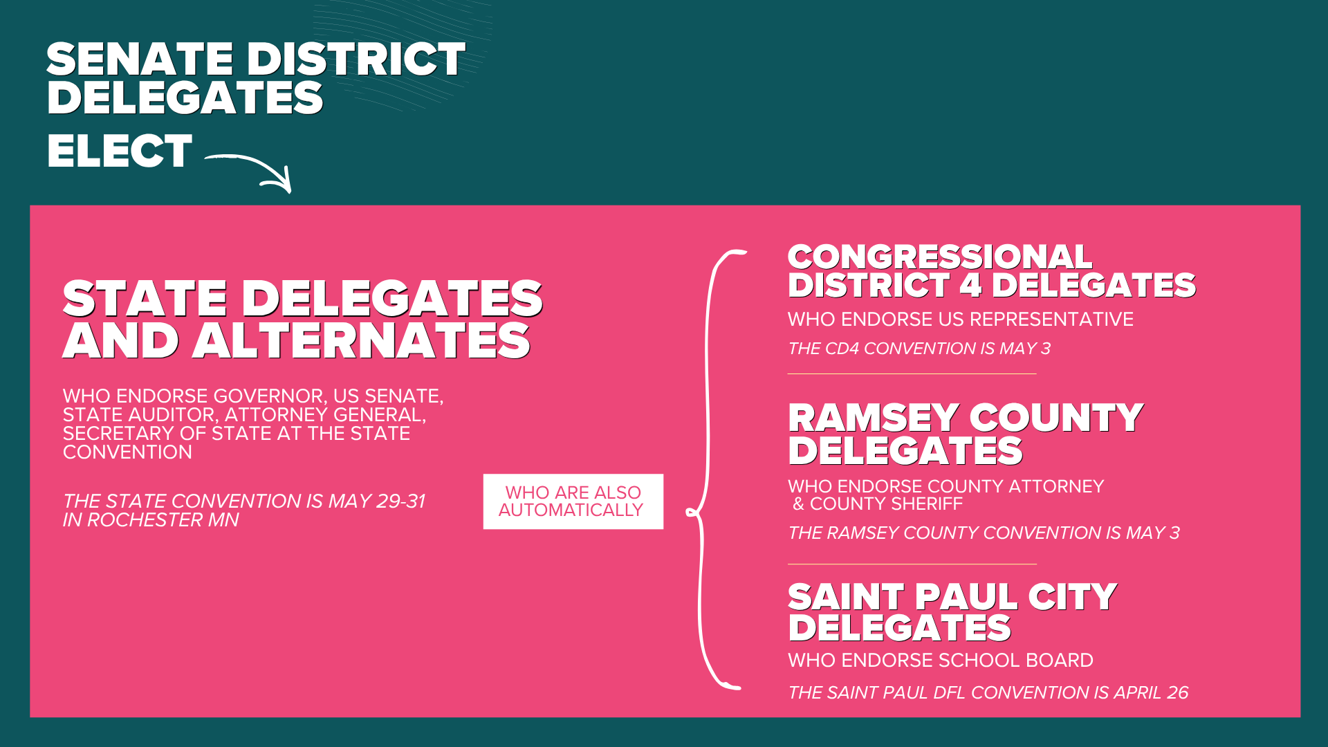 Senate District 64 Delegates elect State Delegates and Alternates, who are also automatically Congressional District 4 Delegates, Ramsey County Delegates who endorse County Attorney and County Sheriff, and Saint Paul Delegates who endorse school board.